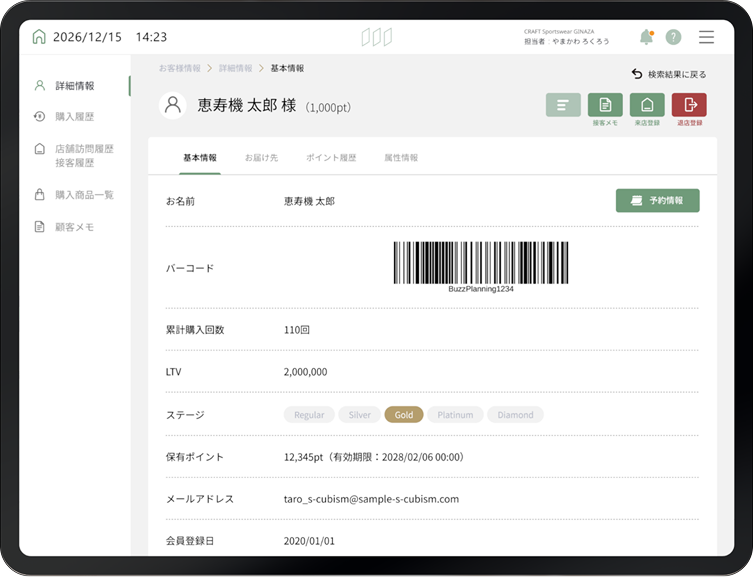 顧客の基本情報を、シンプルに閲覧できます。例えば、そのままレジ会計を行うための会員バーコード表示や、各種履歴の参照など、多様なデータの活用が可能です。特に、接客の起点となる以下の項目:
